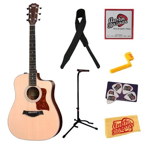 Bundle includes Taylor 210ce Dreadnought Cutaway Acoustic-Electric Guitar, Stand, Leather Strap, Strings, String Winder, Pick Card, and Polishing Cloth.